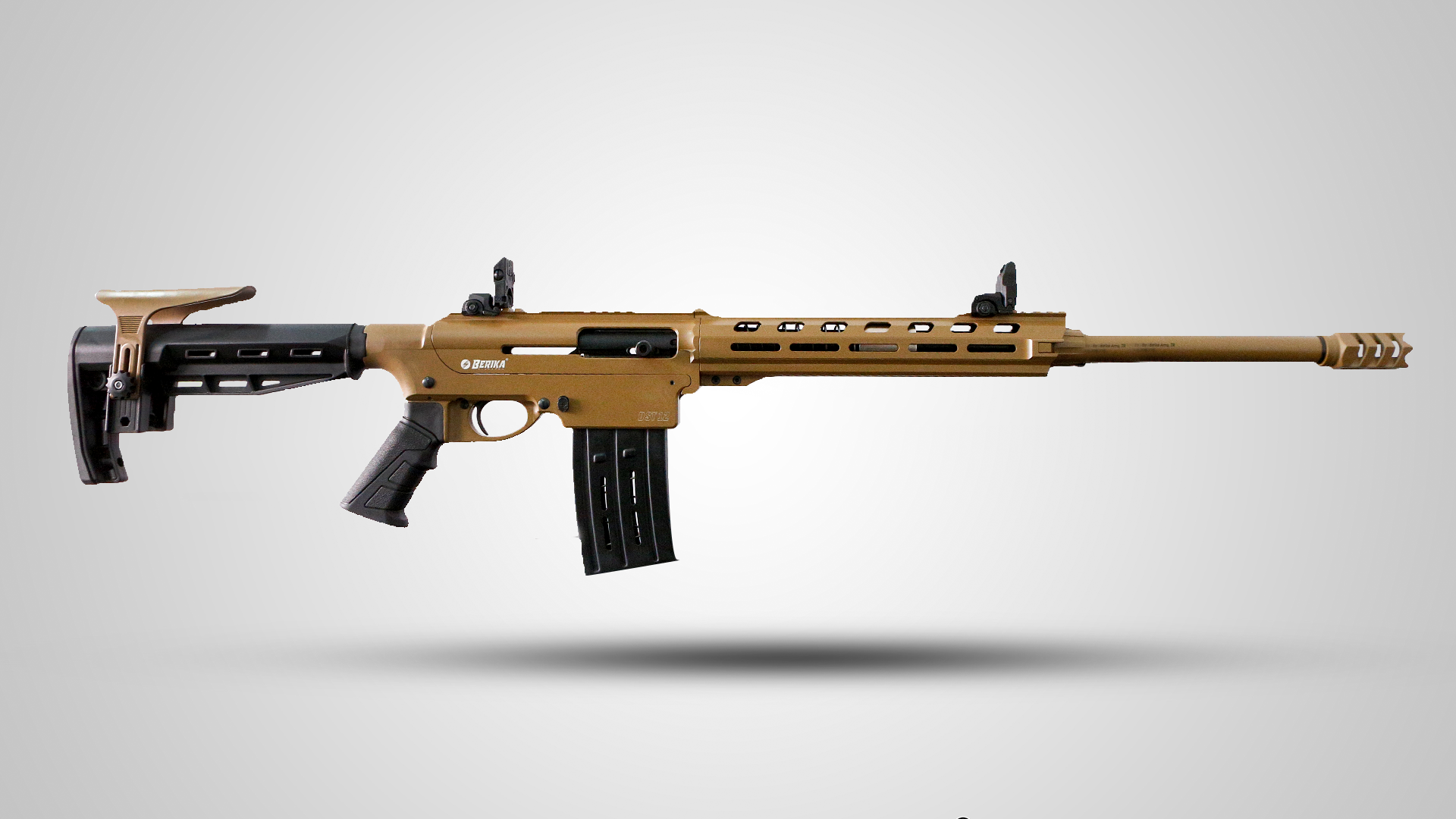 Introducing our most succesfull Shotgun of the year: The Berika® DESERT STORM has fully aluminium patented® upper and lower receiver. One of the most important feature is whole trigger set can be remove by taking out two pins with your hands. So once you are finish your job with your gun you can remove the trigger set for your family safety. It’s designed to look and handle like an AR-15 in order to reduce training time and preserve muscle memory when switching over from an AR rifle. The 20 inch chrome-lined barrel is threaded for removable chokes. The precision reamed ordnance steel grade barrel is threaded to accept the Beretta/Benelli Mobile Choke system. The 5 and 10 round removable box magazine is large enough for any CQB scenario that may arise. With a railed receiver you can attach a variety of tactical accessories to suite your home defense needs or equip for competition and hunting